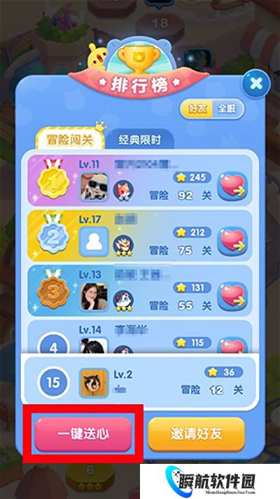 2、在排行榜详细界面可以看到自己的好友,点击一键送心;