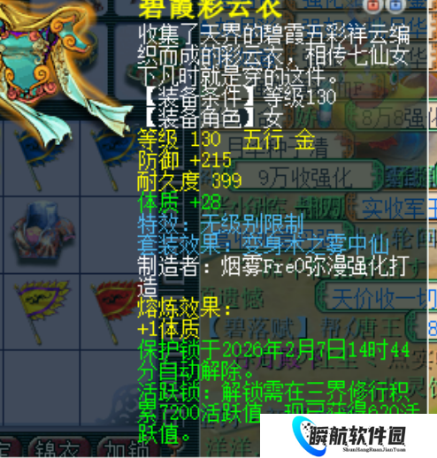 玩家鉴定出一件130级无级别女衣,防御高达215点,单加属性28点。