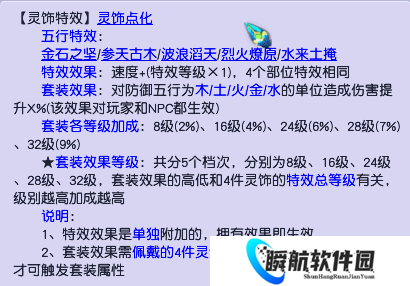 举个例子,一套4级的水来土掩套装,则会加4×4=16点面板速度,然后提升对防御属性为水单位4%的输出。