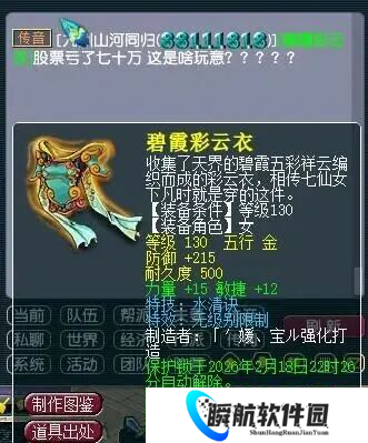 玩家在传音中展示了自己鉴定出的130级力敏双加、带水清诀无级别限制的女衣。运气好到爆炸,可以过个肥年了。