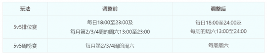 为了给玩家提供更自由的玩法参与时间,自2025年12月2日维护后,“5v5排位赛”和“5v5周榜赛”玩法开启时间延长: