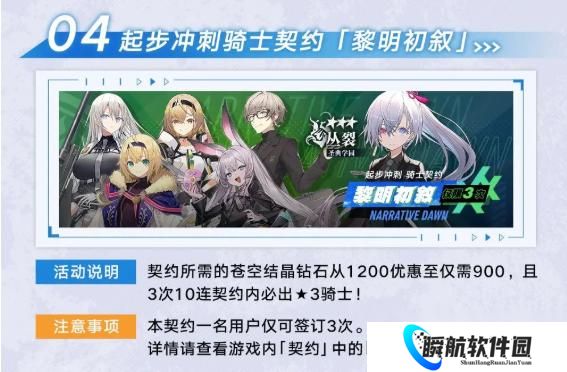4、起步冲刺骑士契约「黎明初叙」:契约所需的苍空结晶钻石从1200优惠至仅需900,且3次10连契约内必出3星骑士,仅可签订1次。