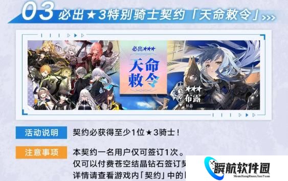 3、必出3星特别骑士契约「天命敕令」:契约必获得至少1位3星骑士,仅可签订1次,可以付费苍空结晶钻石签订契约。
