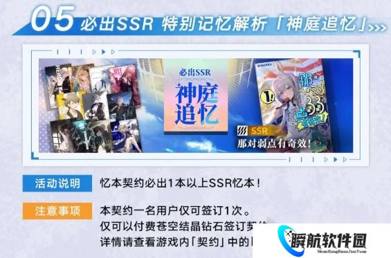 5、必出SSR特别记忆解析「神庭追忆」:忆本契约必出1本以上SSR忆本,仅可签订1次,可以付费苍空结晶钻石签订契约。