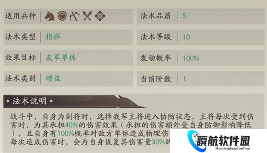 他是队伍中的次要核心。固有法术“乾坤玉剑”为主将分担伤害后反击,同时主将造成伤害时还会为自身恢复一定兵力,此法术可以避免在面对一些高爆发阵容时主将的状态被快速压低,进一步提升阵容的稳定性。法术选择“攻必有备”为自己叠加攻击与防御属性,配合固有法术可快速叠加。剩下法术选择“一莲万景”造成高额伤害的同时群体恢复兵力,为队伍进一步增强续航能力。