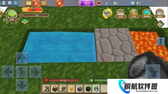 左边的坑是用来放水的,右边的坑是用来放岩浆,划重点:左边的坑第2个格子向下挖2块土地,这样会形成一个阶梯,水会向下流动!