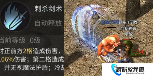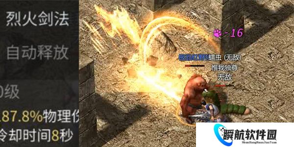 烈火剑法:战士的高级技能,将焚尽一切的烈焰附着于刀锋之上,造成大量伤害的同时有几率无视魔法护盾。