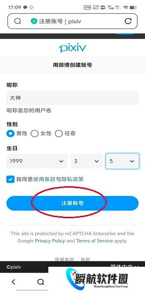 7、输入昵称,选择性别,设置生日,勾选同意使用条款和隐私政策,点击“注册账号”。
