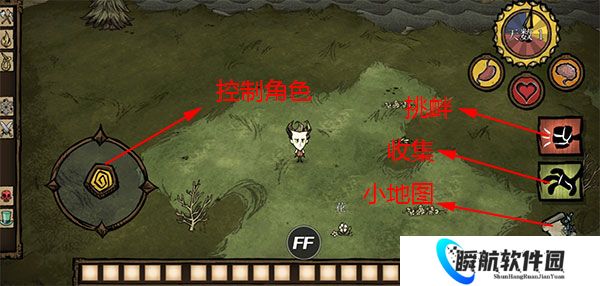 5、游戏就正式开始了,左边是控制角色方向的,右边是收集的,玩家需要收集一切能被利用的资源来躲避饥荒。