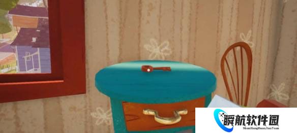 邻居家的钥匙在左边二楼红窗旁边蓝色的桌子上,在自己家一楼卧室拿到纸箱子,去邻居家门口左边梯子上去放上两个纸箱子,然后跳到屋檐上。