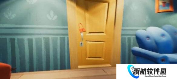 拿到蓝色桌子上的钥匙,去往一楼客厅,打开蓝色沙发旁边的黄色门,进入地下室。