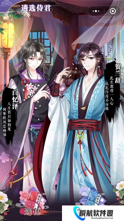 1、入游戏后一开始是选一个侍奉你的美男子,一个是叫白忆泽,一个叫贺兰辞,两个人随便选择一个都可以;