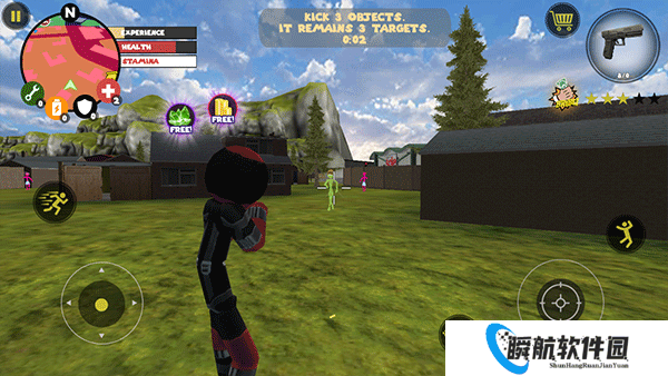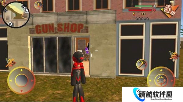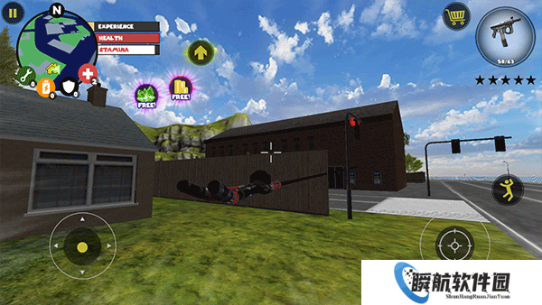 左侧移动、加速,右侧绳索,攻击(跳跃),跳跃,右上侧的武器更换以及血量、经验的显示都实时更新,一览无遗,凭借着大家自由的玩法,与其他帮派的人物进行交火,期间**能够获得经验,杀多了会产生星级,**和其他附近角色会特殊照顾你对你展开火热的进攻,而如何存活,如何将其他人物击杀则是你所需要完成的任务。