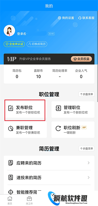 3、注册完后,在我的界面中点击发布职位,然后发布自己的招聘职位需求即可。